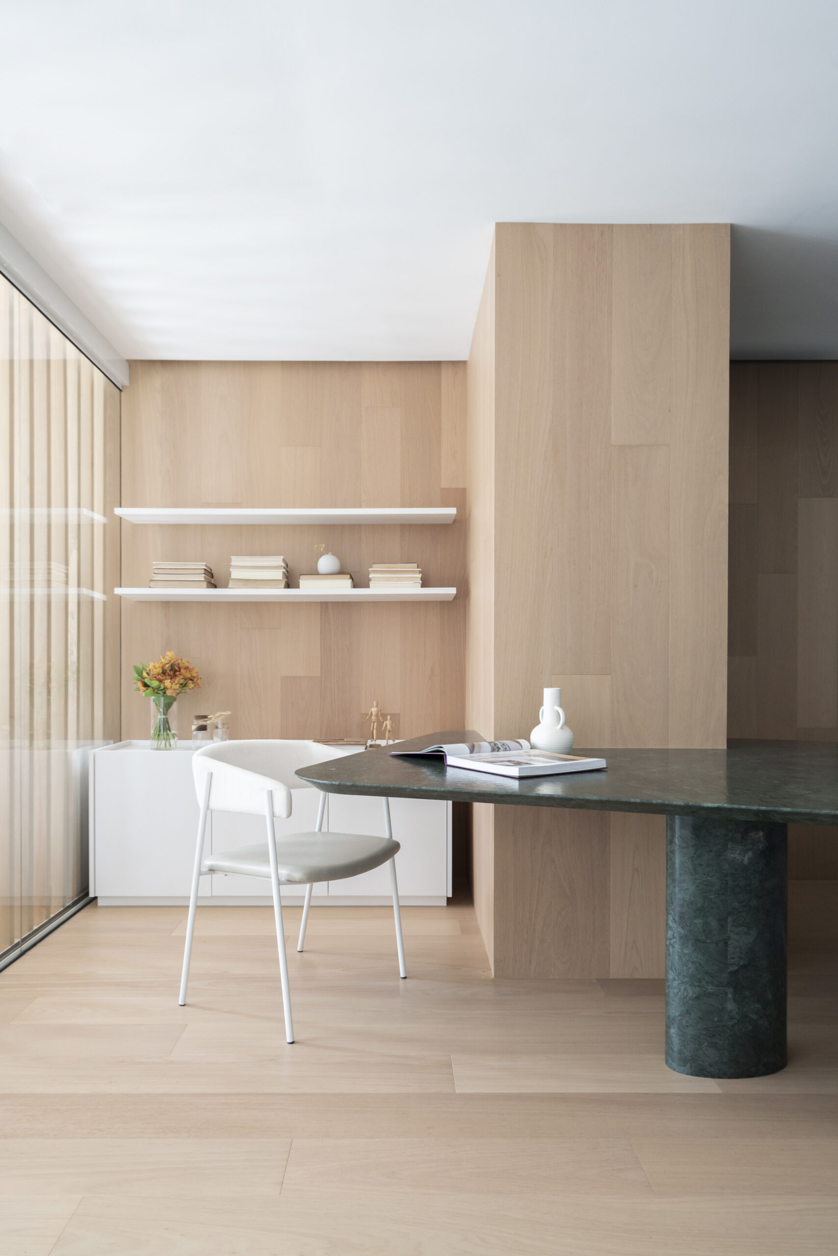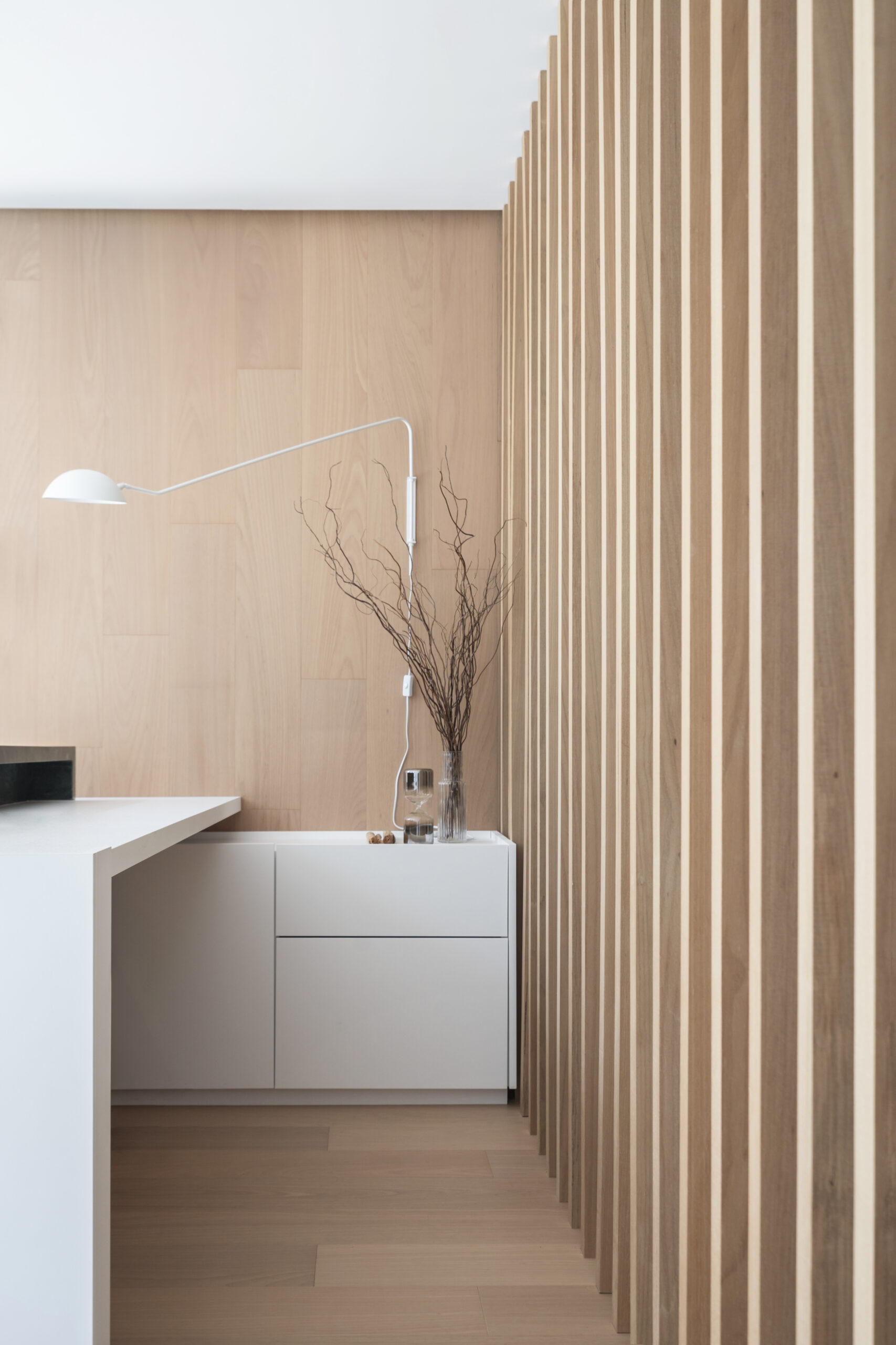 Os móveis planejados da Evviva desempenham um papel central no conceito do projeto, trazendo soluções práticas e sofisticadas em lâmina padrão Bianco Luce. Este acabamento, com sua tonalidade clara e textura sutil, reforça a atmosfera clean que permeia todo o espaço. Puxadores Tip-On foram utilizados nos armários e painéis, assegurando um visual minimalista e contínuo. Essa escolha estratégica elimina elementos visuais excessivos, permitindo que as superfícies e o layout fluido se destaquem de forma harmoniosa.